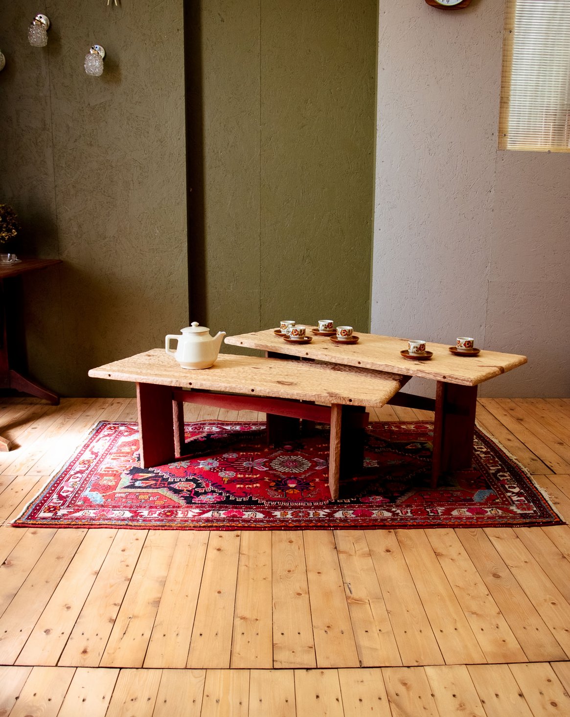 Offrez à votre intérieur cette paire de tables basses gigognes entièrement restaurée, composée de plateaux sculptés et d’un assemblage singulier issu de mobilier recyclé. Le plateau en pin massif clair dialogue avec des pieds en coumarou foncé et un contrevent en hêtre rouge, créant un contraste de teintes et de textures. Leur gabarit allongé et les hauteurs décalées offrent une surface modulable pour livres, tasses ou plantes, idéale dans un salon. Le travail de sculpture apporte une touche chaleureuse et artisanale.