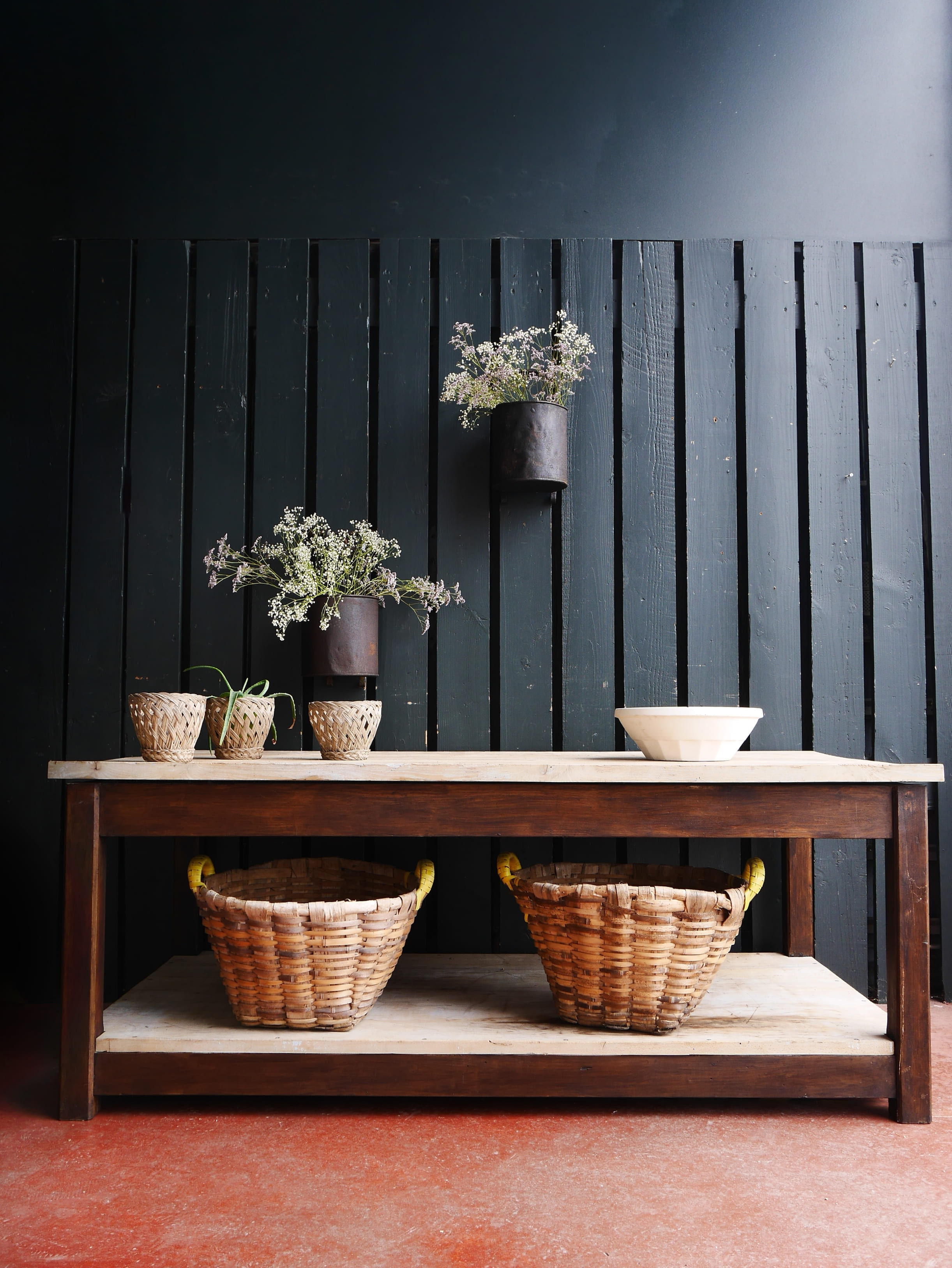 Dans une cuisine, elle devient un plan de travail généreux et plein de caractère. Dans un salon ou une salle à manger, elle se transforme en grande console accueillant objets décoratifs, paniers et vaisselle ancienne. Elle trouve également sa place dans un bureau ou un atelier, où son plateau solide se prête aussi bien à l’exposition qu’à l’usage quotidien. Son étagère inférieure apporte une praticité supplémentaire, idéale pour le rangement.