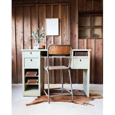Découvrez ce bureau encrier en bois peint d'un vert doux, alliant élégance vintage et sobriété contemporaine. Son plateau fin et ses étagères intégrées offrent un espace de travail bien organisé, avec plusieurs tablettes et tiroirs pour ranger papiers et accessoires tout en laissant une belle amplitude pour les jambes. Compact mais généreux, il s'adapte à une chambre ou un coin bureau lumineux. Trois serrures métalliques et une clé d'ornement ajoutent une note raffinée et narrative.