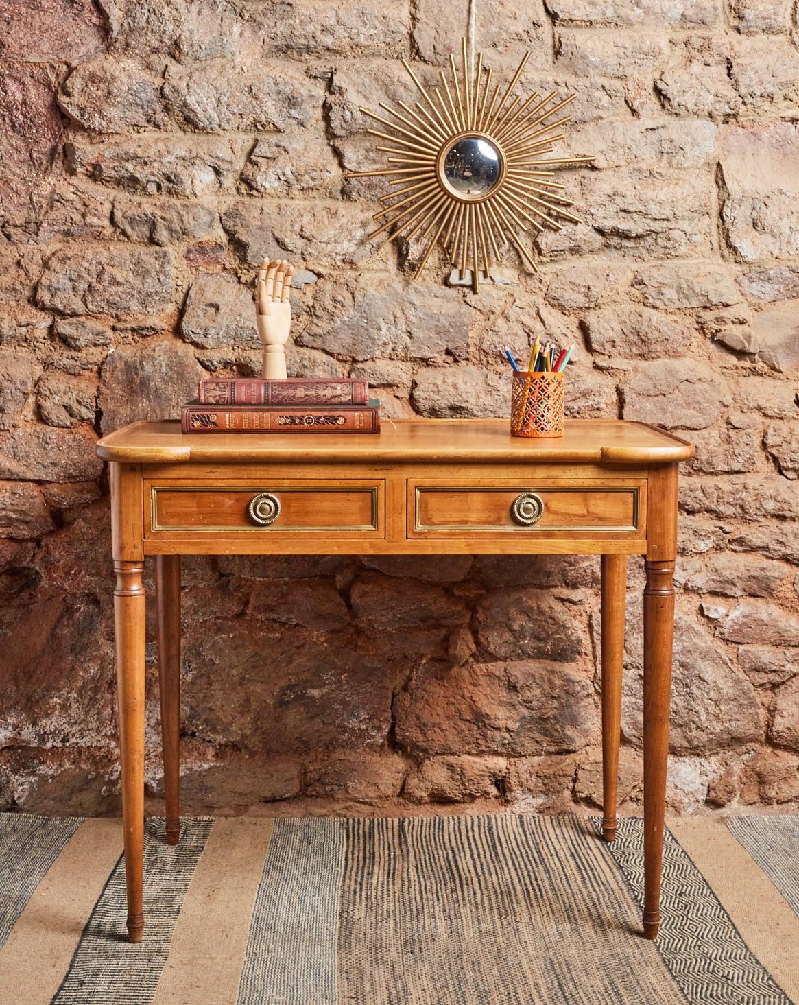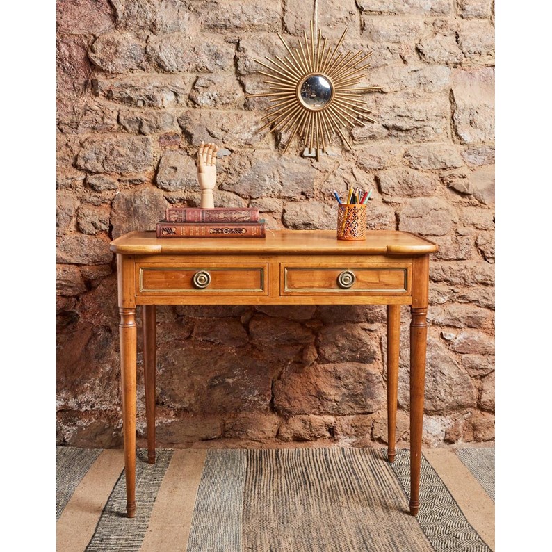 Adoptez ce bureau de style Louis XVI, aux lignes classiques et raffinées qui apportent une note d'élégance discrète à votre intérieur. Pensé pour le quotidien, il propose deux tiroirs pratiques pour organiser vos papiers et deux grands plateaux latéraux destinés à exposer lampes, objets ou plantes, tout en gardant le plan de travail dégagé. Sa présence crée une atmosphère chaleureuse et intemporelle, parfaite pour un coin bureau ou une entrée où le charme ancien dialogue avec l'utilité.
