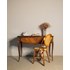 Adoptez ce bureau à trois tiroirs où la marqueterie raffinée habille la façade et dialogue avec des poignées et ornements en laiton, posés sur des pieds courbés qui lui donnent une silhouette élégante. Le plateau décoré de motifs triangulaires offre un plan de travail accueillant et pratique, tandis que les tiroirs à battant dévoilent étagères et compartiments pour un rangement organisé. Parfait pour un coin bureau ou une entrée au style classique et chaleureux. Quelques traces du temps et rayures se confondent dans sa beauté, et un ornement en forme de patte de lion manque sur le pied avant droit.