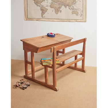 Découvrez ce pupitre en bois pensé pour deux enfants, aux lignes simples et à l'assise partagée qui invite au dessin, à la lecture et aux jeux à deux. Le bois poncé lui confère un toucher doux et une allure naturelle, apportant chaleur et sobriété à une chambre ou un espace d'activités. Sa largeur généreuse permet de s'installer côte à côte, favorisant la convivialité et le travail en duo. Légères traces du temps présentes.