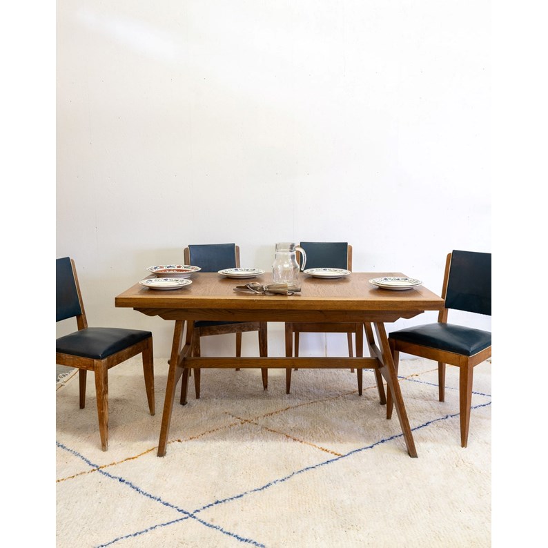 Adoptez cette table à manger en bois attribuée à René Gabriel, dont l'esthétique sobre et fonctionnelle rappelle l'élégance du milieu du siècle. Ses lignes mettent en valeur un design réfléchi et chaleureux. Pensée pour 4 à 6 convives, ses proportions offrent une assise conviviale et un plateau propice aux repas partagés et aux conversations quotidiennes. Sa finition boisée installe une ambiance intimiste et intemporelle dans la salle à manger. Quelques traces du temps et un défaut sur le plateau qui racontent son histoire.