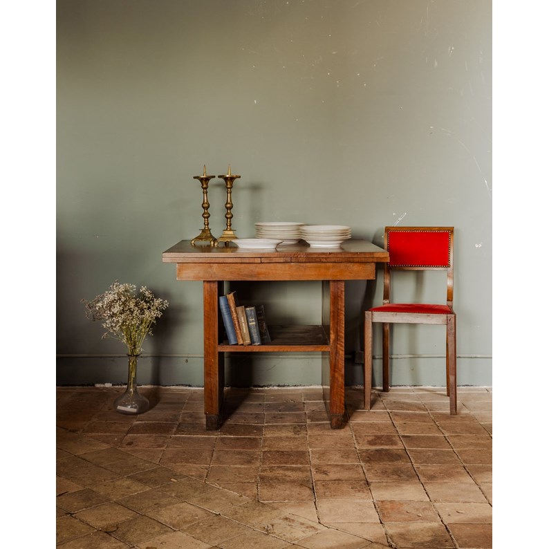 Sublimez votre salle à manger avec cette table Art déco en bois au plateau extensible, où élégance et fonctionnalité se répondent. Son sous-plateau discret et son mécanisme déployable accueillent 4 à 6 convives au quotidien et jusqu'à 8 pour les grandes tablées, tandis que ses proportions graphiques rappellent le style des années 30. La patine du bois apporte une chaleur raffinée et un cachet authentique. Quelques traces du temps sont présentes.