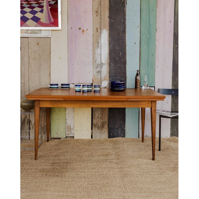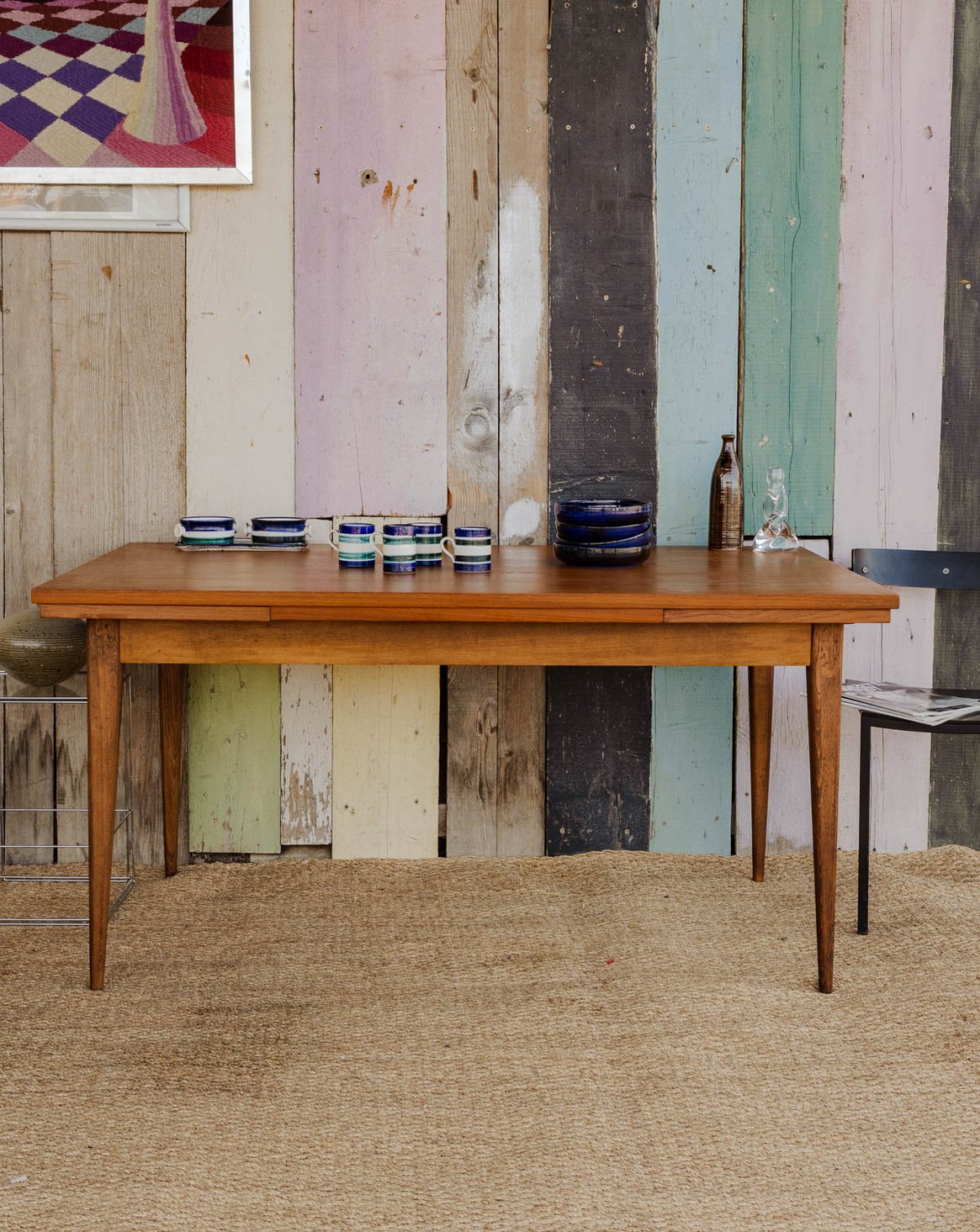 Sublimez votre salle à manger avec cette table en teck, dont la présence chaleureuse apporte une patine profonde et naturelle à la pièce. Conçue pour accueillir confortablement de quatre à six convives au quotidien, elle se transforme en une grande table d'hôtes grâce à ses rallonges pour recevoir plus de convives lors des repas festifs. Sa structure robuste et ses proportions généreuses offrent stabilité et caractère, créant une atmosphère conviviale et raffinée. Quelques traces du temps présentes.