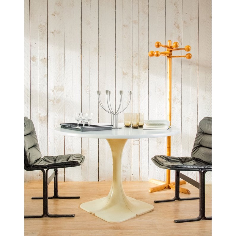 Adoptez cette table tulipe au design iconique, idéale pour recevoir 4 à 6 convives dans un esprit élégant et convivial. Sa silhouette épurée, son plateau généreux et son piètement central libèrent l'espace et favorisent une circulation fluide, tout en apportant une présence graphique et contemporaine à la pièce. La finition soignée met en valeur une allure sobre qui s'accorde aussi bien à un intérieur moderne qu'à une décoration plus douce. Deux tous petits éclats dans le plateau et très légères traces du temps, pour parfaire son charme.