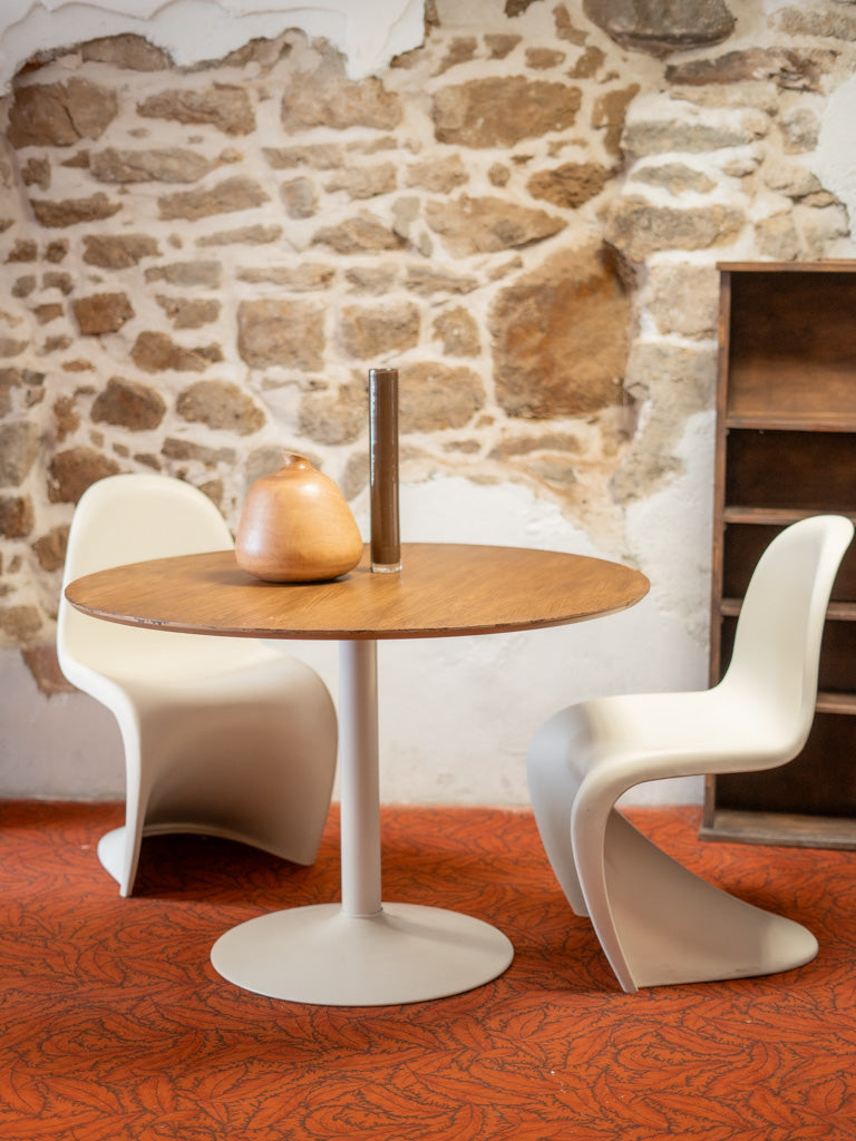 Découvrez cette charmante ancienne table à manger au design rétro, dotée d'un élégant pied central tulipe en métal et d'un chaleureux plateau en bois. Sa forme ronde en font un espace convivial jusqu'à 5 personnes pour partager des repas en famille ou entre amis. Bien que le plateau présente quelques traces d’usure, celles-ci ajoutent au caractère authentique de la pièce. Idéale pour les amateurs de décoration vintage, elle allie esthétique et fonctionnalité avec brio.