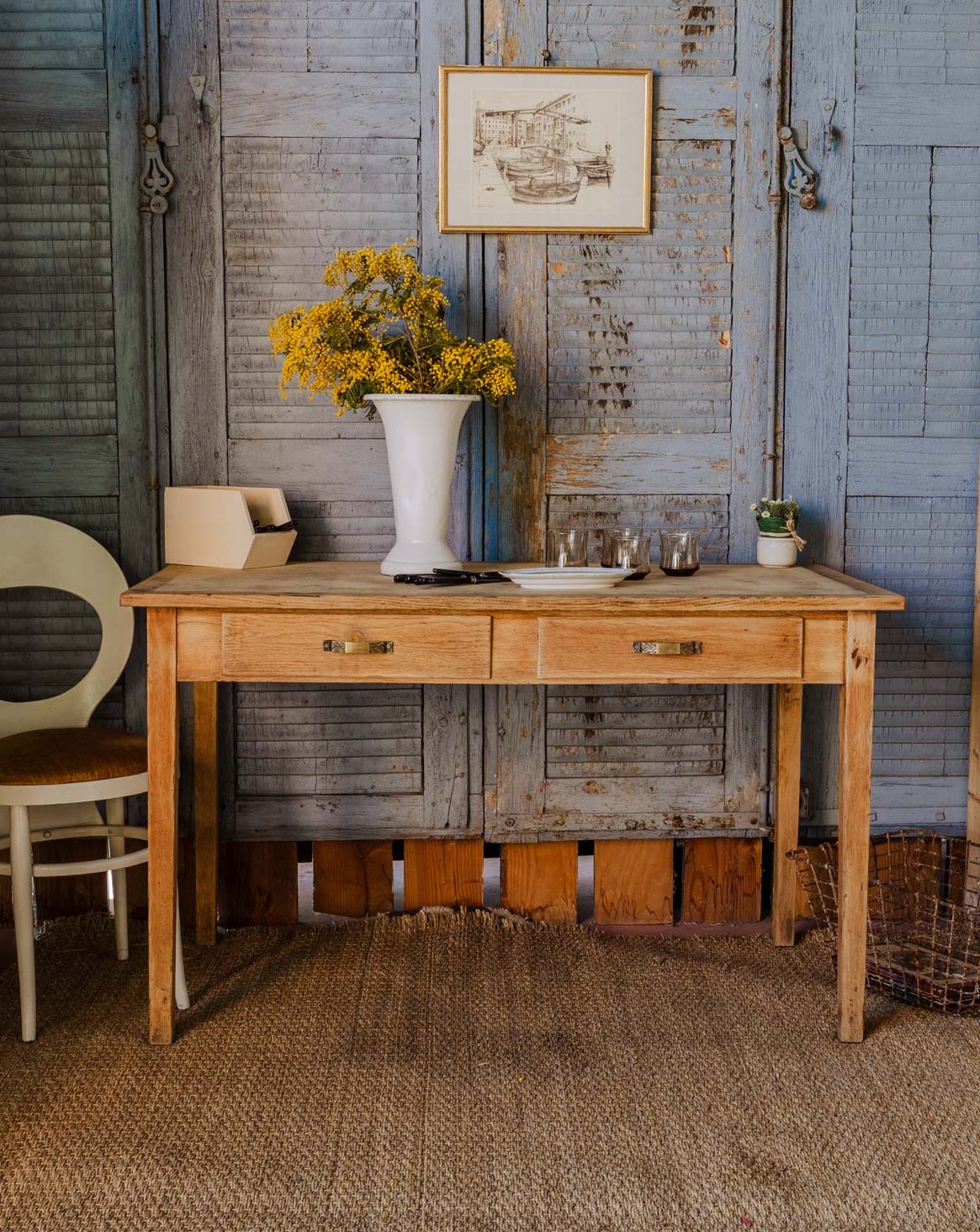 Sublimez vos repas avec cette table à manger en bois au design sobre et lumineux, qui diffuse une atmosphère chaleureuse dans une salle à manger. Ses lignes épurées et ses deux tiroirs munis de poignées d'origine dorées lui donnent une élégance discrète tout en offrant un rangement pratique pour nappes et couverts. Ses proportions la rendent conviviale et adaptée à un repas à quatre ou comme table de travail le temps d'une journée. Quelques traces du temps présentes.