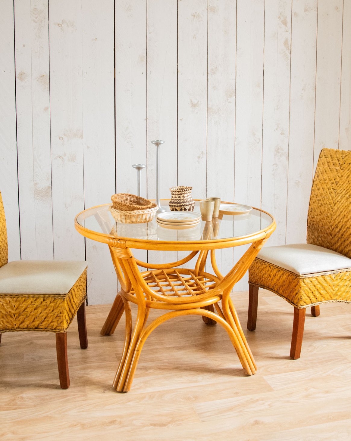 Invitez une atmosphère chaleureuse et naturelle avec cette table en rotin au plateau de verre, dont la teinte claire illumine l'espace et apporte une touche d'élégance organique. Sa structure légère accueille confortablement 4 à 6 convives, idéale pour les petits dîners ou un coin repas convivial, tandis que le dessus en verre facilite l'entretien et met en valeur la texture du rotin. Rayures d'usage discrètes sur le plateau. Présence de légères traces du temps.