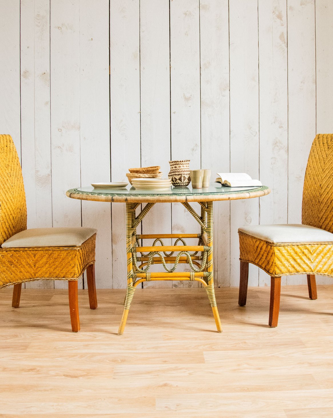Invitez cette table en rotin clair et vert au plateau de verre et au piètement carré, qui marie structure contemporaine et charme naturel. Le tressage du rotin et la teinte verte apportent une présence végétale et chaleureuse, idéale pour une salle à manger intime ou un coin repas convivial. Pensée pour accueillir 4 à 6 convives, sa surface en verre facilite l'entretien tout en révélant la texture du matériau. Rayures d'usage discrètes.