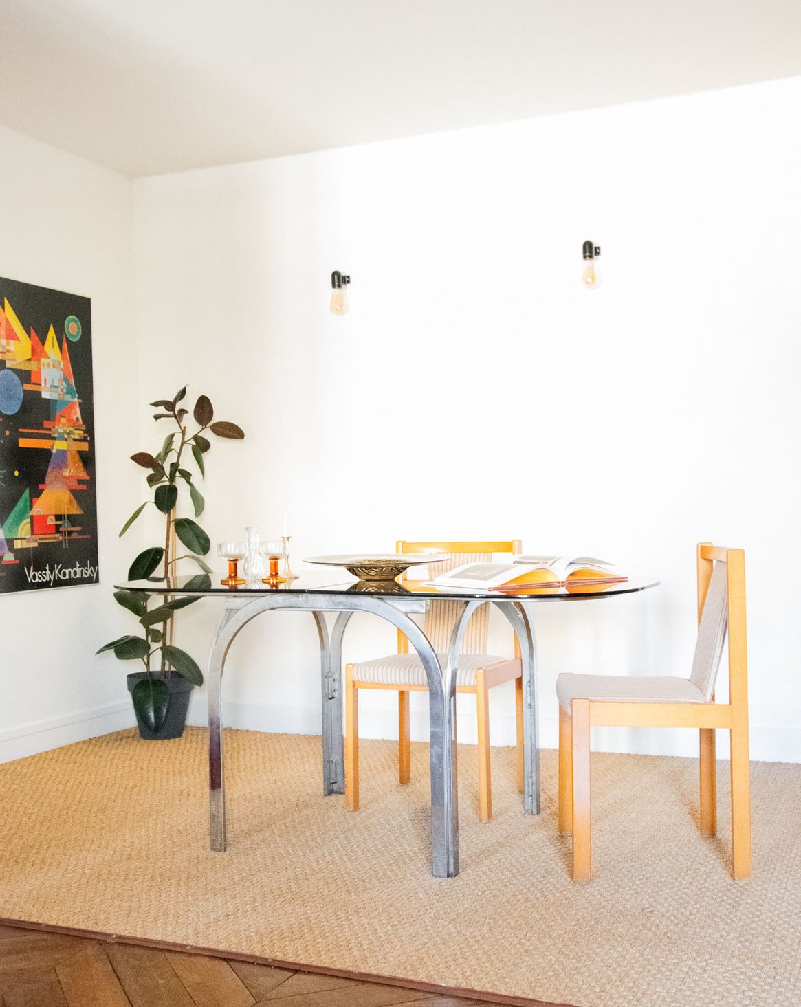 Adoptez cette table en métal chromé au plateau en verre fumé, dont l'allure contemporaine apporte une note élégante et graphique à la salle à manger ou au salon; ses proportions généreuses offrent une belle capacité d'accueil pour 4 à 6 convives et elle peut se compléter d'une rallonge pour agrandir l'espace lors des réceptions. La structure demande une réparation lorsque la rallonge est positionnée sur les pieds. Quelques marques d'usage qui font son authenticité.