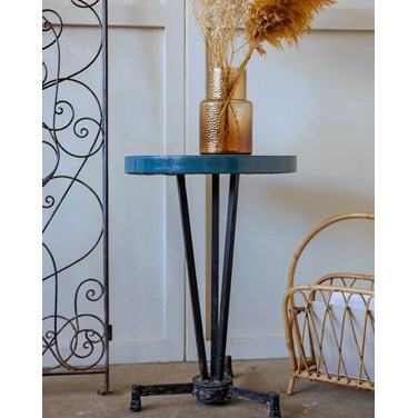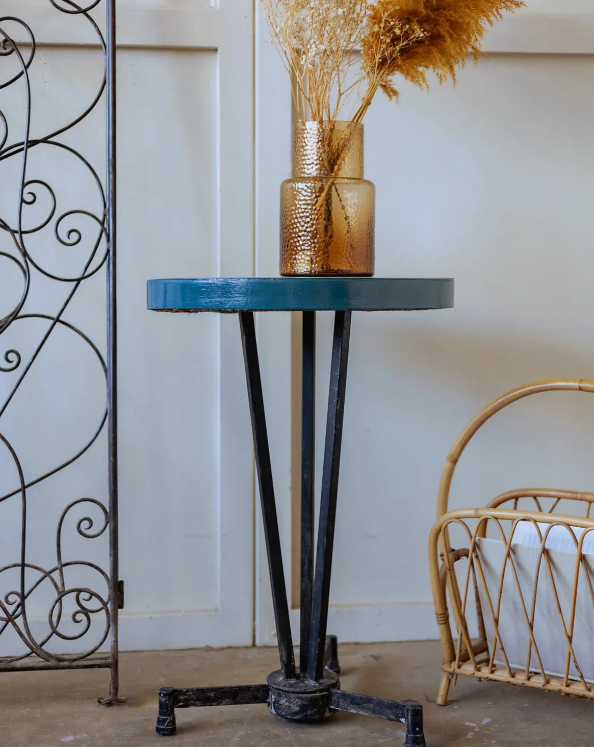 Adoptez ce guéridon bistrot au piètement métallique tripode et au plateau rond peint en bleu paon puis protégé d'un vernis brillant, qui apporte une note graphique et chaleureuse à votre intérieur. Son format compact en fait une table d'appoint idéale pour un coin café, un balcon ou une entrée, mariant élégance industrielle et praticité grâce à la solidité du métal et de la fonte. Pieds en fonte laissés dans leur jus. Légères traces du temps présentes.