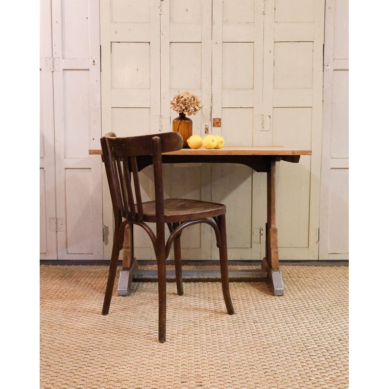 Sublimez votre coin repas avec cette table de ferme bistrot en bois sculpté, où les pieds travaillés et les détails métalliques signent un style à la fois rustique et élégant. Son plateau fin et son format compact offrent un espace convivial pour quatre couverts, idéal en cuisine ou dans un café intimiste. Le bois patiné diffuse une chaleur naturelle tandis que les ferrures soulignent son caractère artisanal. Parfaite pour accueillir jusqu'à 4 convives. Trois exemplaires disponibles.