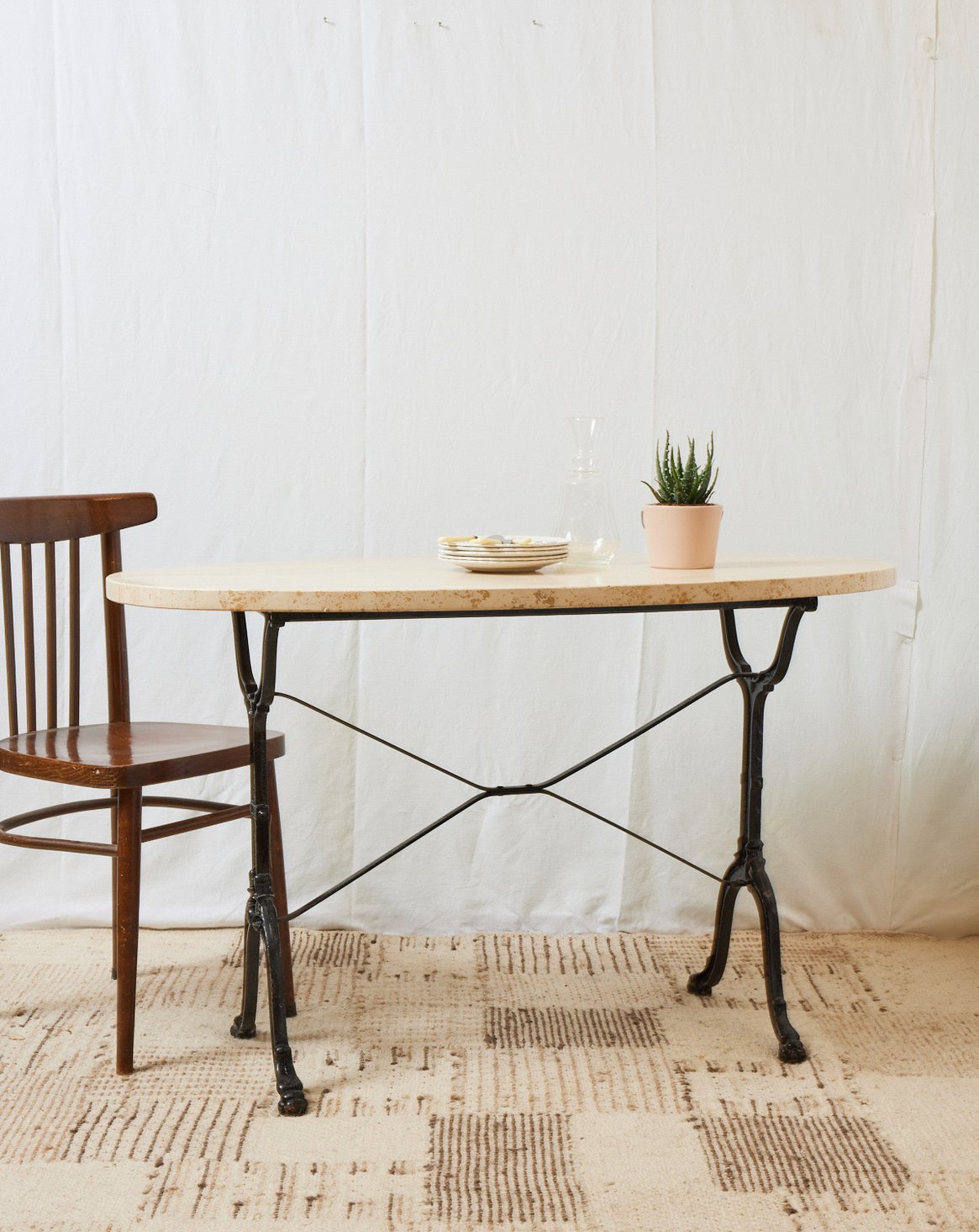 Découvrez cette table bistro Raoux Paris de 1946, coiffée d'un plateau en marbre blanc au veinage discret qui capte la lumière. Son piètement serti souligne une silhouette élégante et stable, pensée pour accueillir confortablement deux convives et s'intégrer dans un coin café ou une petite salle à manger. Son allure rétro évoque une atmosphère parisienne feutrée, parfaite pour des moments intimistes autour d'un espresso ou d'un dîner léger.