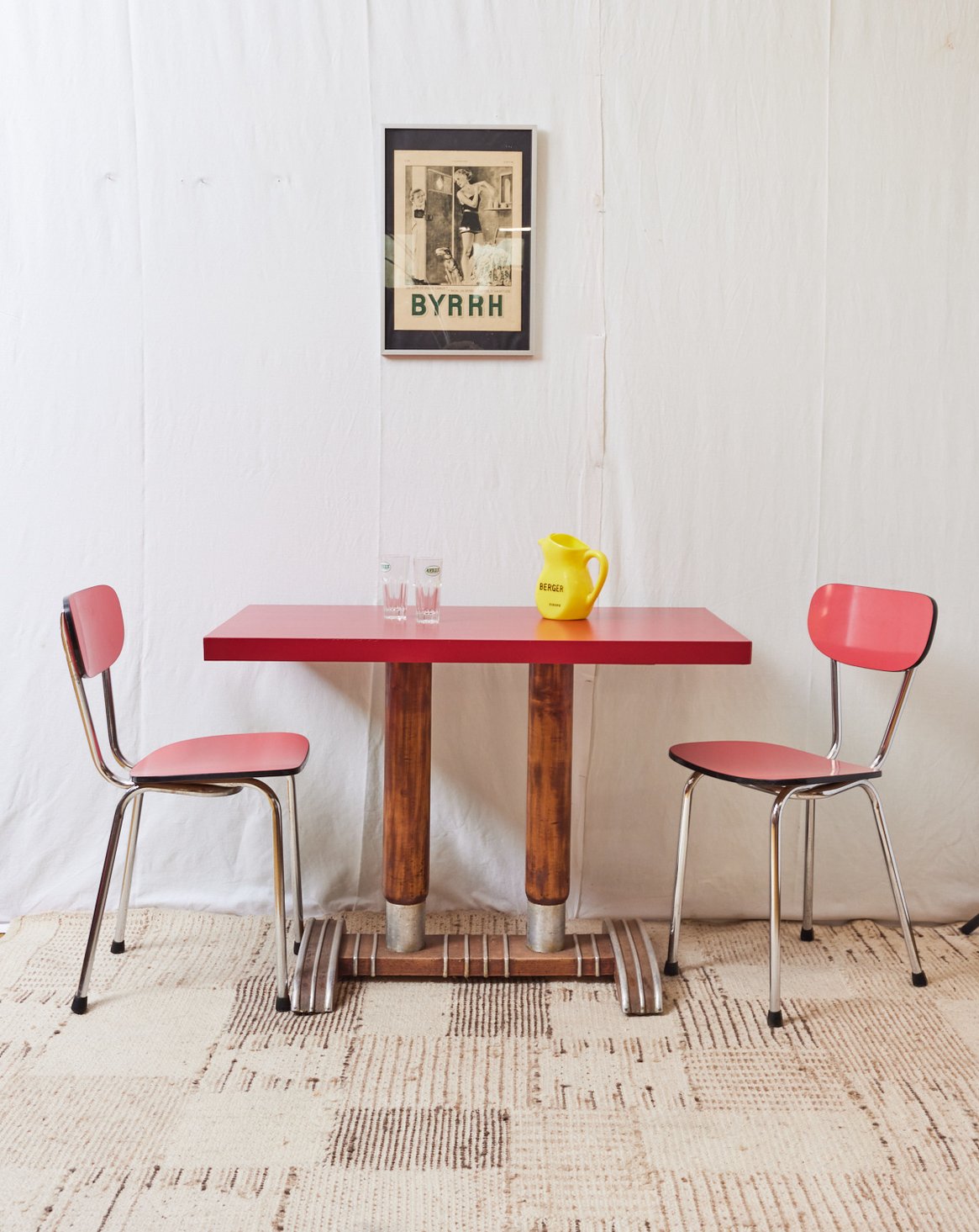 Découvrez cette table de bistro rénovée peinte d'un rouge profond, qui attire le regard sans envahir l'espace. Le piétement en bois massif lui apporte stabilité et chaleur tandis que les détails en métal typiques rappellent l'esprit des cafés parisiens. Conçue pour accueillir quatre convives, elle trouve sa place dans une cuisine compacte ou un coin repas lumineux, invitant à des moments conviviaux et à des repas partagés. Son équilibre entre couleur affirmée et matériaux naturels crée une atmosphère accueillante.
