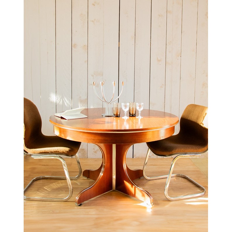 Invitez convivialité et élégance avec cette table papillon pensée pour 4 à 6 convives : sa structure lourde en inox assure stabilité et présence, tandis que le placage couleur palissandre apporte chaleur et raffinement. Sa rallonge coulissante se déploie facilement pour accueillir des invités supplémentaires, idéale pour une salle à manger ou un espace modulable où les proportions généreuses prennent sens. Un éclat discret dans le placage et quelques traces du temps sur le plateau.