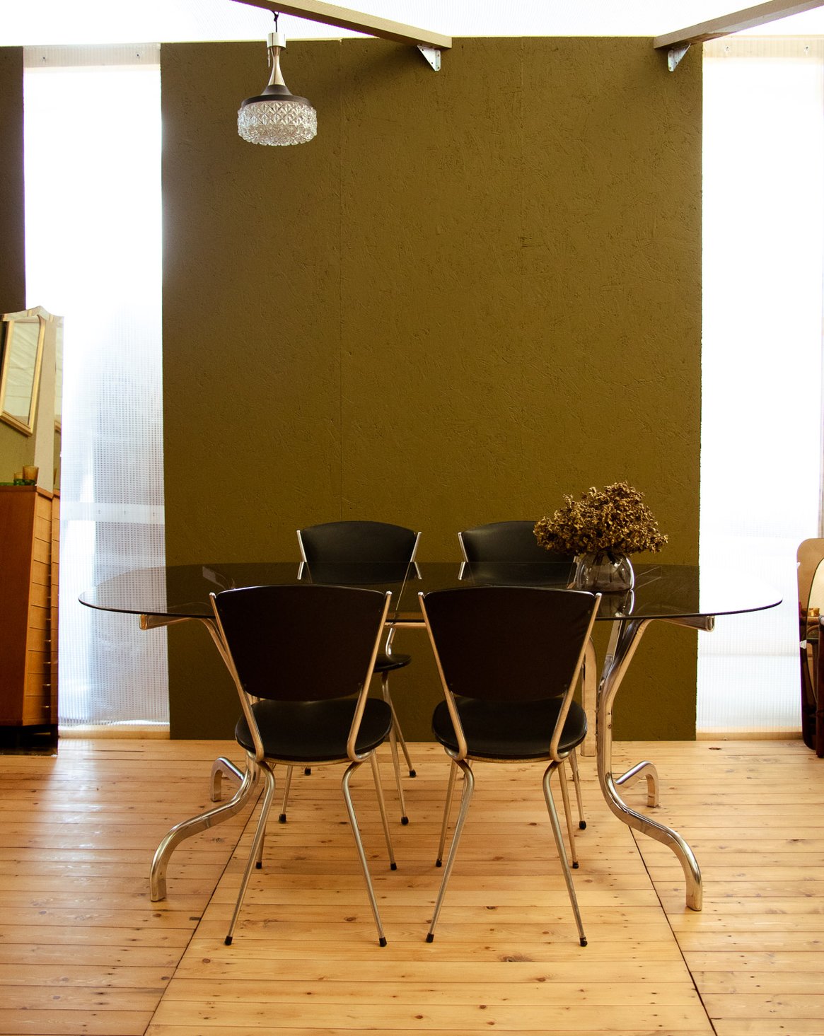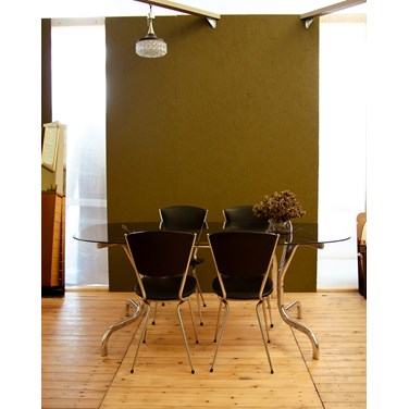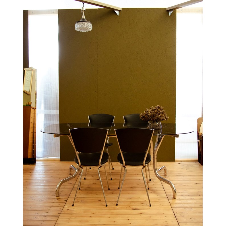 Découvrez cette table à manger au plateau en verre fumé et au pied chromé, dont la silhouette marie lignes contemporaines et douceur des arrondis. Pensée pour accueillir six convives, ses proportions généreuses structurent l'espace sans alourdir la pièce, idéale pour repas conviviaux ou dîners sophistiqués. Le verre fumé apporte une profondeur feutrée tandis que le métal poli souligne une allure résolument élégante. Légères rayures sur le plateau et piqures sur le métal.