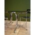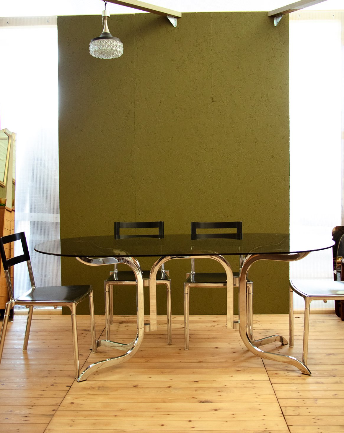 Apportez une touche contemporaine avec cette table au plateau en verre fumé aux lignes rectangulaires aux angles légèrement arrondis, reposant sur des pieds en métal chromé aux proportions élancées. Conçue pour accueillir confortablement six convives, elle conjugue transparence tamisée et structure brillante pour une ambiance à la fois sophistiquée et chaleureuse, idéale en salle à manger ou en cuisine ouverte. Léger défaut sur le plateau en verre et traces discrètes sur le métal.