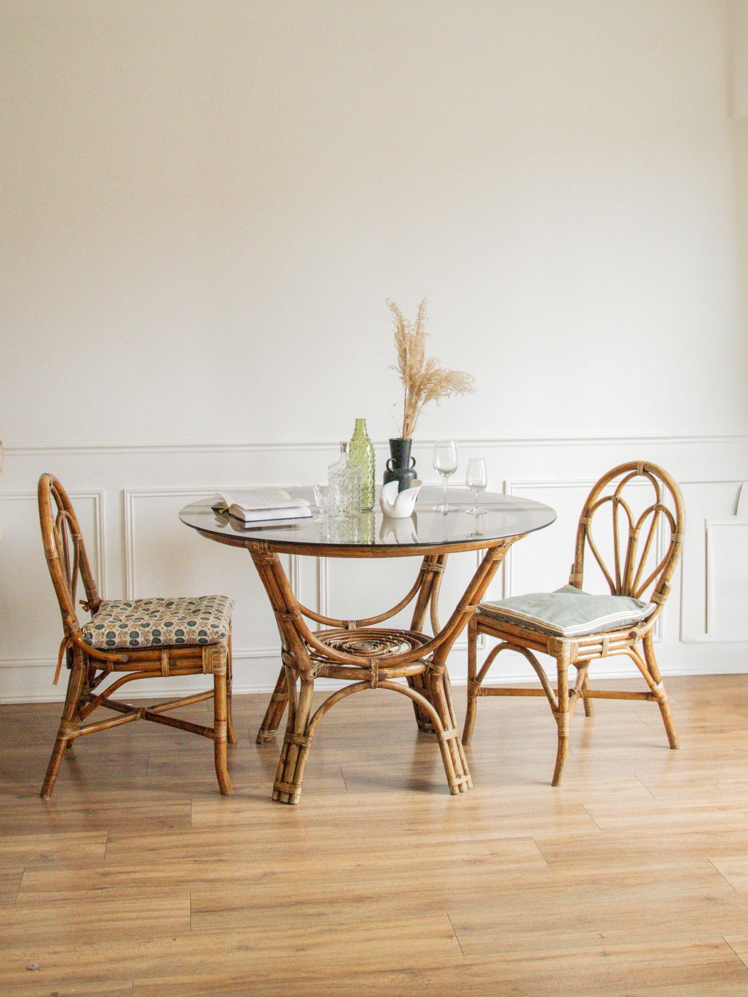 Apportez une touche d'élégance à votre intérieur avec cette table à manger ronde en rotin au plateau en verre fumé, idéale pour accueillir jusqu'à 4 convives. Son design raffiné et sa structure en rotin s'harmonisent parfaitement avec une atmosphère chaleureuse et conviviale. Associez-la à la paire de chaises en rotin N°691, pour une création d'espace à la fois chic et confortable, parfaite pour des moments de partage inoubliables.