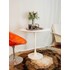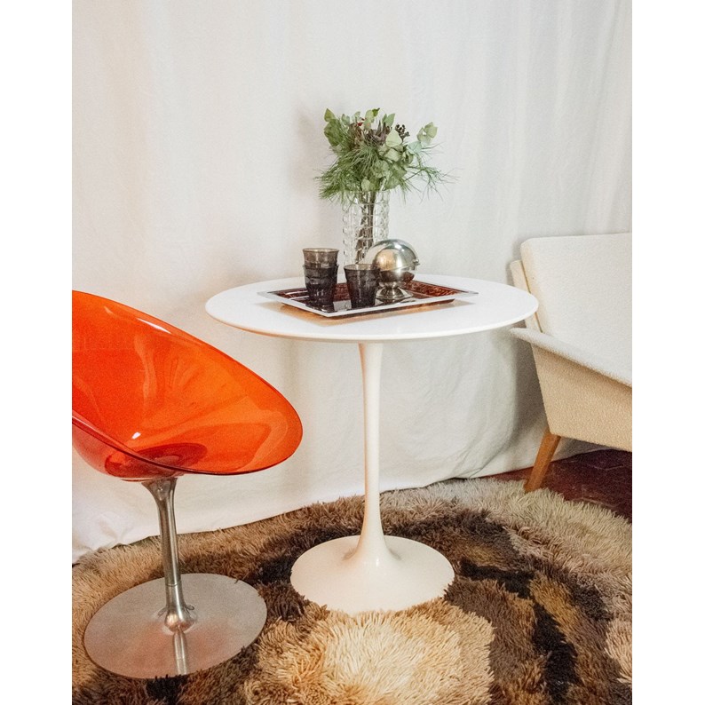 Adoptez cette table tulipe au plateau rond blanc, inspirée du style Knoll, qui marie l'esthétique des années 50 à une ligne contemporaine. Son plateau mat et son piètement central élancé en métal laqué offrent une silhouette légère qui libère l'espace et facilite le placement des sièges. Compacte mais généreuse en proportions, elle accueille confortablement deux à quatre convives et convient autant à un coin repas qu'à un bureau minimaliste, apportant une atmosphère lumineuse et raffinée. Légères traces du temps discrètes.