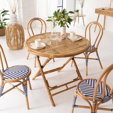 Table ronde en bambou naturelle, idéale pour créer une ambiance bohème et chaleureuse. Légère et élégante, parfaite pour un intérieur ou une terrasse conviviale.