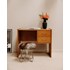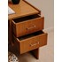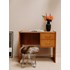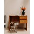 Adoptez ce petit bureau vintage en placage de chêne, au charme discret et aux lignes épurées. Sa surface compacte et ses deux tiroirs offrent un plan de travail pratique pour un coin bureau ou une coiffeuse, tandis que les poignées chromées apportent une touche de contraste contemporain. Les jambes élancées lui confèrent une silhouette légère, parfaite pour aménager un espace réduit avec élégance, et la chaleur du bois installe une ambiance accueillante et inspirante.