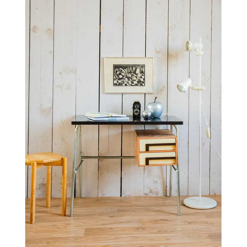Adoptez ce bureau style Pierre Garriche, édité pour la capsule Prisunic en 1977, qui marie esprit rétro et fonctionnalité contemporaine. Son plateau en médium laqué marron foncé repose sur une structure métallique tubulaire légère, dessinant une silhouette épurée et équilibrée. Deux tiroirs en résine beige et brun offrent un rangement discret et un joli contraste de matières, idéal pour organiser son poste de travail ou aménager un coin d’écriture. Son gabarit contenu s’intègre facilement aux espaces mesurés.