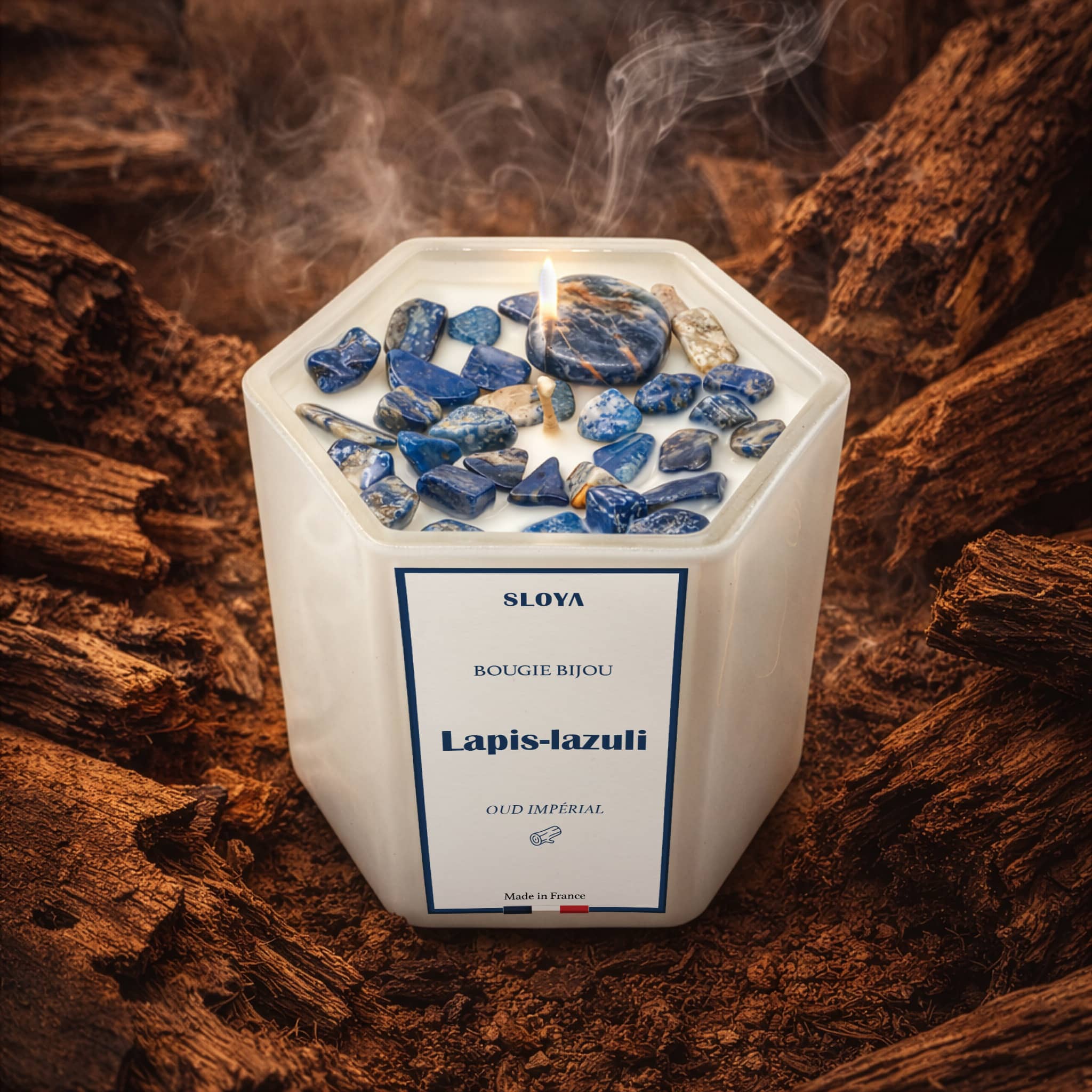 Bougie bijou pierres lapis-lazuli - parfum oud impérial