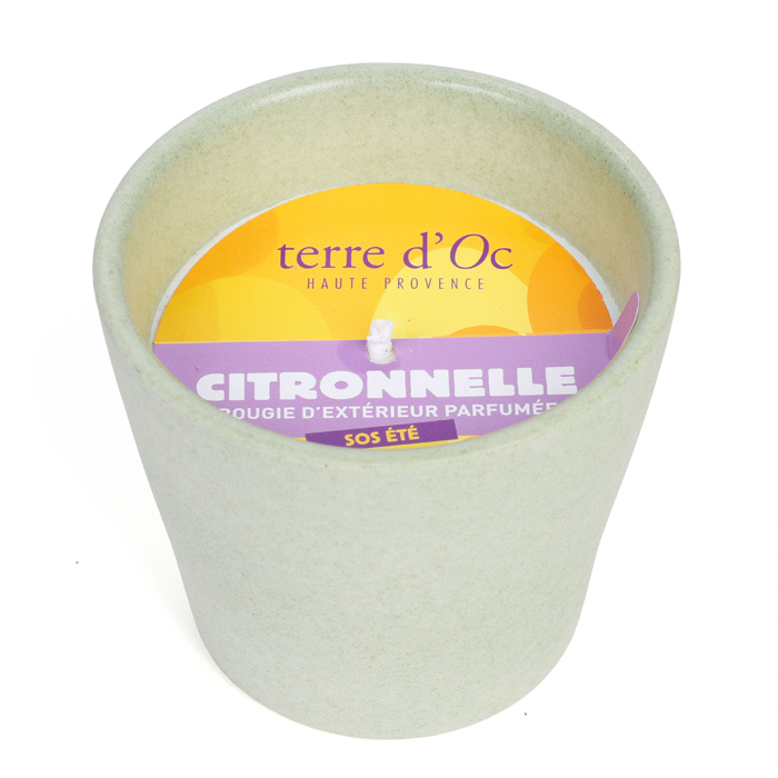 Bougie d'extérieur parfumée citronnelle SOS été en cire végétale terre d'Oc Pot vert