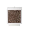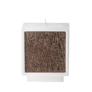 Dans un jeu de matières, cette bougie sculptée en stéarine se pare d'une texture imitant le bois en son centre, tandis qu'un effet << cristaux de neige >> habille le socle et les côtés.