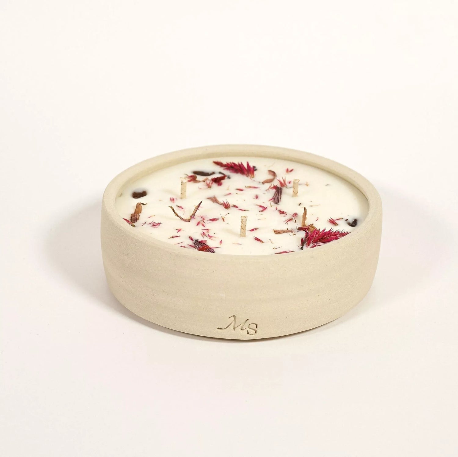 Cire vegetale de soja, parfums de Grasse sans CMR, fleurs sechees du jardin, meche en coton et ame en papier