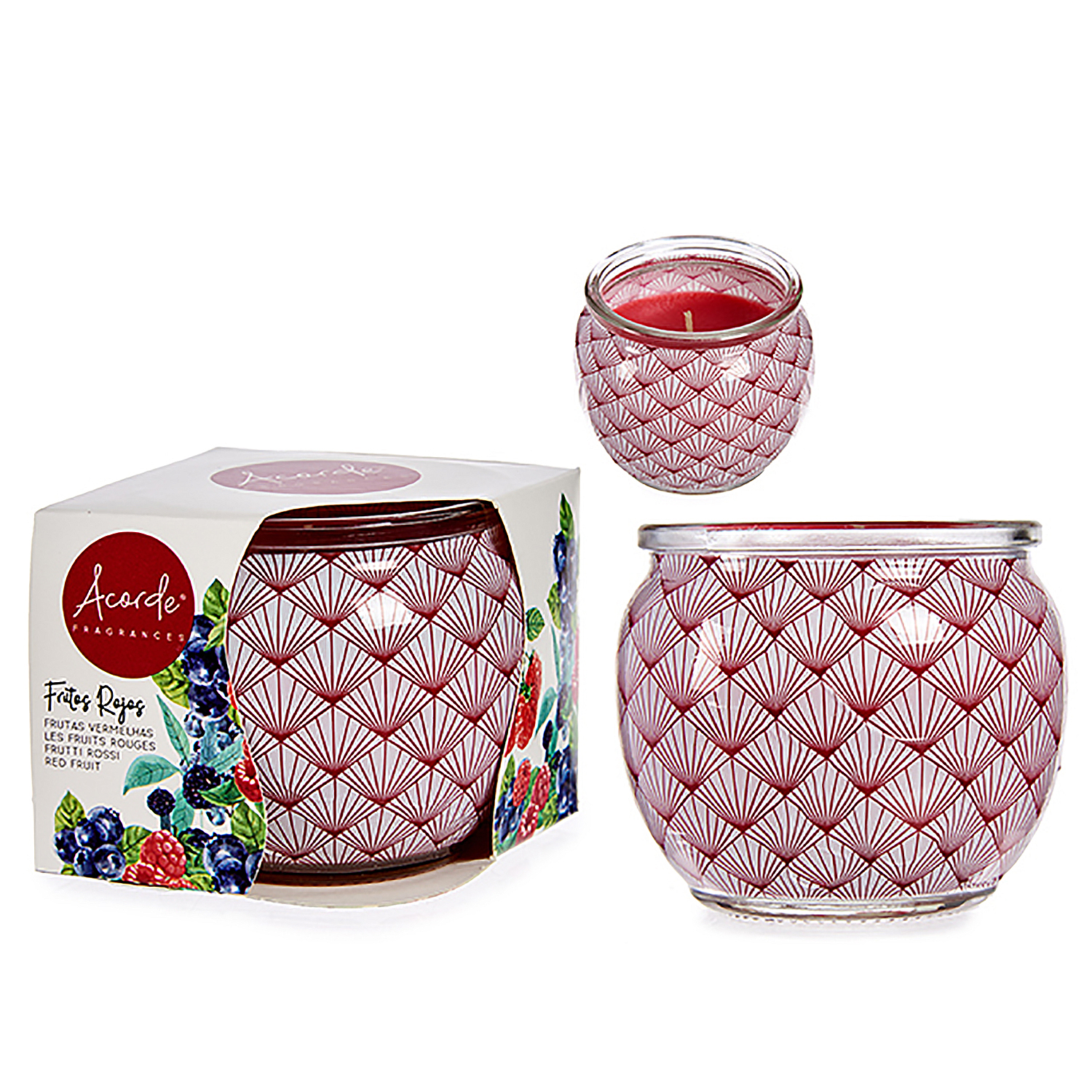 Bougie parfumée dans un pot en verre au parfum de fruits des bois.