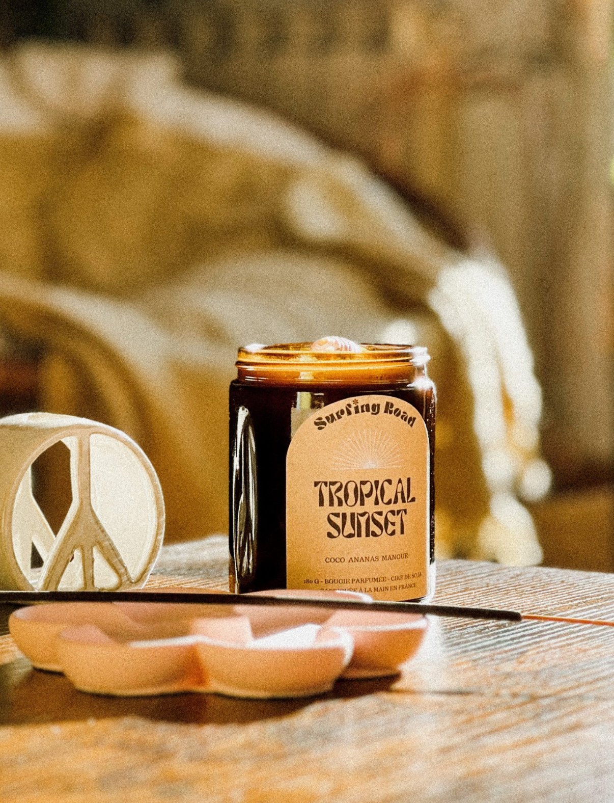 Offrez-vous une ambiance tropicale et chaleureuse avec la bougie Sunset, parfaite pour vos moments de relaxation et de bien-être.