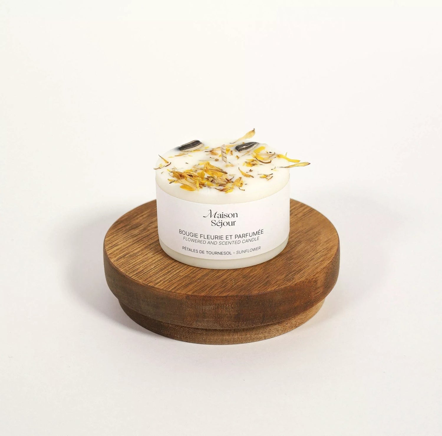 Cire vegetale de soja, parfums de Grasse sans CMR, fleurs sechees du jardin, meche en coton et ame en papier