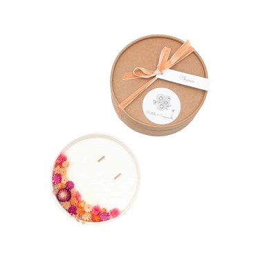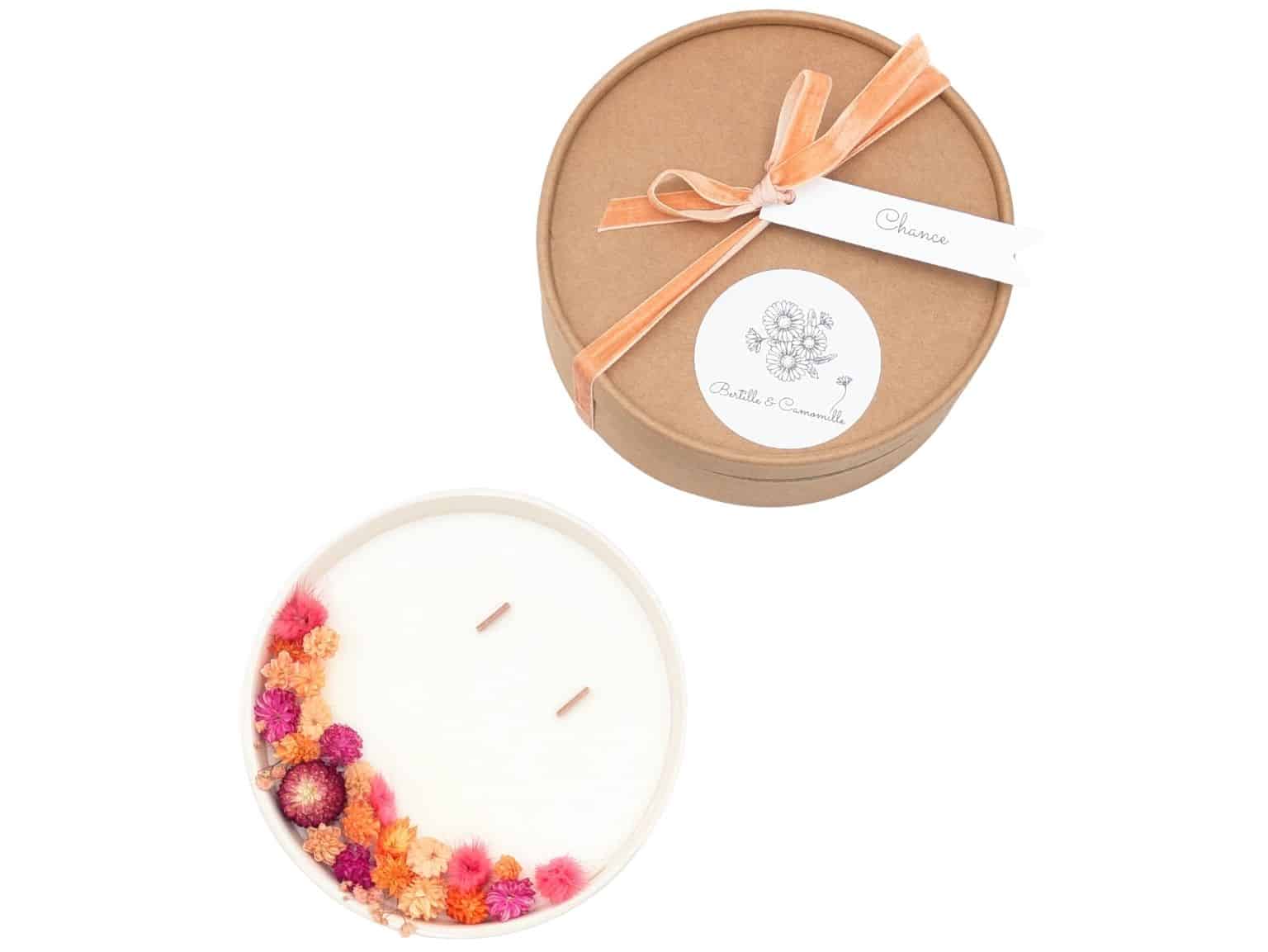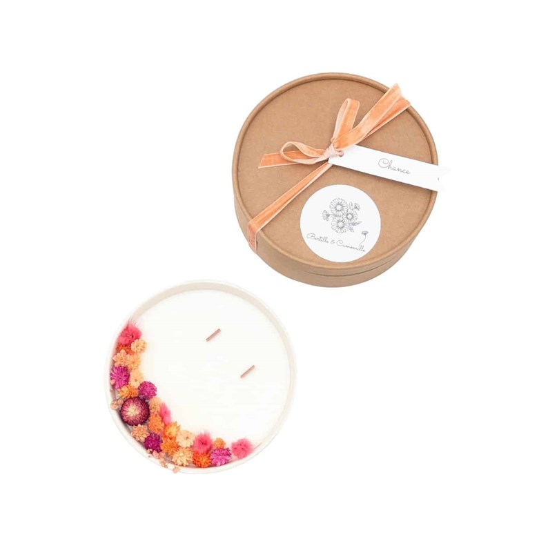 Conseils d’utilisation :Nos bougies sont pensées comme de véritables objets de décoration et de bien-être. Voici quelques gestes simples pour prolonger leur beauté et savourer pleinement chaque instant :Une flamme qui protège vos fleurs :Les mèches sont volontairement décentrées afin de préserver les fleurs séchées et de garder la bougie esthétique jusqu’à la dernière lueur. Toute la cire ne se consumera pas entièrement : c’est un choix assumé, pour que votre bougie reste jolie le plus longtemps possible.Un temps de pause idéal :Pour éviter que les fleurs ne se rapprochent trop de la flamme, laissez brûler votre bougie par sessions d’environ une heure.Un petit rituel d’entretien :Si une fleur venait à se détacher et à flotter dans la cire, éteignez la flamme et, tant que la cire est encore liquide, retirez-la délicatement à l’aide d’une pince à épiler ou d’une petite cuillère. Ce geste préservera la beauté de la cire et la qualité de la combustion.Prendre soin de la mèche :Nos mèches en bois crépitent comme un feu de cheminée. Pour conserver cette jolie flamme et éviter qu’un excès de charbon ne colore trop la cire, coupez délicatement la mèche à environ 5 mm avant chaque nouvelle utilisationUn moment en toute sécurité :Placez toujours la bougie sur une surface plane, loin des courants d’air, et ne la laissez jamais sans surveillance. Tenez-la hors de portée des enfants et des animaux.Ces quelques gestes transforment l’allumage de votre bougie en un doux rituel, pour profiter longtemps de sa lumière et de son parfum