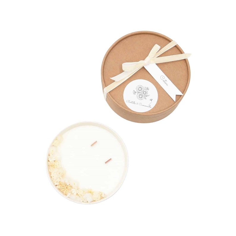 Conseils d’utilisation :Nos bougies sont pensées comme de véritables objets de décoration et de bien-être. Voici quelques gestes simples pour prolonger leur beauté et savourer pleinement chaque instant :Une flamme qui protège vos fleurs :Les mèches sont volontairement décentrées afin de préserver les fleurs séchées et de garder la bougie esthétique jusqu’à la dernière lueur. Toute la cire ne se consumera pas entièrement : c’est un choix assumé, pour que votre bougie reste jolie le plus longtemps possible.Un temps de pause idéal :Pour éviter que les fleurs ne se rapprochent trop de la flamme, laissez brûler votre bougie par sessions d’environ une heure.Un petit rituel d’entretien :Si une fleur venait à se détacher et à flotter dans la cire, éteignez la flamme et, tant que la cire est encore liquide, retirez-la délicatement à l’aide d’une pince à épiler ou d’une petite cuillère. Ce geste préservera la beauté de la cire et la qualité de la combustion.Prendre soin de la mèche :Nos mèches en bois crépitent comme un feu de cheminée. Pour conserver cette jolie flamme et éviter qu’un excès de charbon ne colore trop la cire, coupez délicatement la mèche à environ 5 mm avant chaque nouvelle utilisationUn moment en toute sécurité :Placez toujours la bougie sur une surface plane, loin des courants d’air, et ne la laissez jamais sans surveillance. Tenez-la hors de portée des enfants et des animaux.Ces quelques gestes transforment l’allumage de votre bougie en un doux rituel, pour profiter longtemps de sa lumière et de son parfum