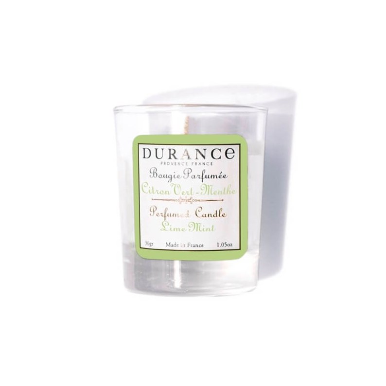 Petite bougie Citron Vert Menthe : 12h de diffusion, parfum frais et acidulé.  En savoir plus