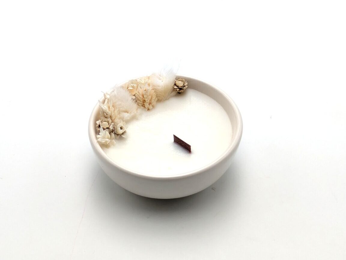 Conseils d’utilisation :Nos bougies sont pensées comme de véritables objets de décoration et de bien-être. Voici quelques gestes simples pour prolonger leur beauté et savourer pleinement chaque instant :Une flamme qui protège vos fleurs :Les mèches sont volontairement décentrées afin de préserver les fleurs séchées et de garder la bougie esthétique jusqu’à la dernière lueur. Toute la cire ne se consumera pas entièrement : c’est un choix assumé, pour que votre bougie reste jolie le plus longtemps possible.Un temps de pause idéal :Pour éviter que les fleurs ne se rapprochent trop de la flamme, laissez brûler votre bougie par sessions d’environ une heure.Un petit rituel d’entretien :Si une fleur venait à se détacher et à flotter dans la cire, éteignez la flamme et, tant que la cire est encore liquide, retirez-la délicatement à l’aide d’une pince à épiler ou d’une petite cuillère. Ce geste préservera la beauté de la cire et la qualité de la combustion.Prendre soin de la mèche :Nos mèches en bois crépitent comme un feu de cheminée. Pour conserver cette jolie flamme et éviter qu’un excès de charbon ne colore trop la cire, coupez délicatement la mèche à environ 5 mm avant chaque nouvelle utilisationUn moment en toute sécurité :Placez toujours la bougie sur une surface plane, loin des courants d’air, et ne la laissez jamais sans surveillance. Tenez-la hors de portée des enfants et des animaux.Ces quelques gestes transforment l’allumage de votre bougie en un doux rituel, pour profiter longtemps de sa lumière et de son parfum