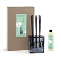 Coffret 27 x 17 x 10.5 cm. 1 vase en verre + 1 capot en céramiques + tiges végétales 22 cm + 1 solution parfumée 250 ml.