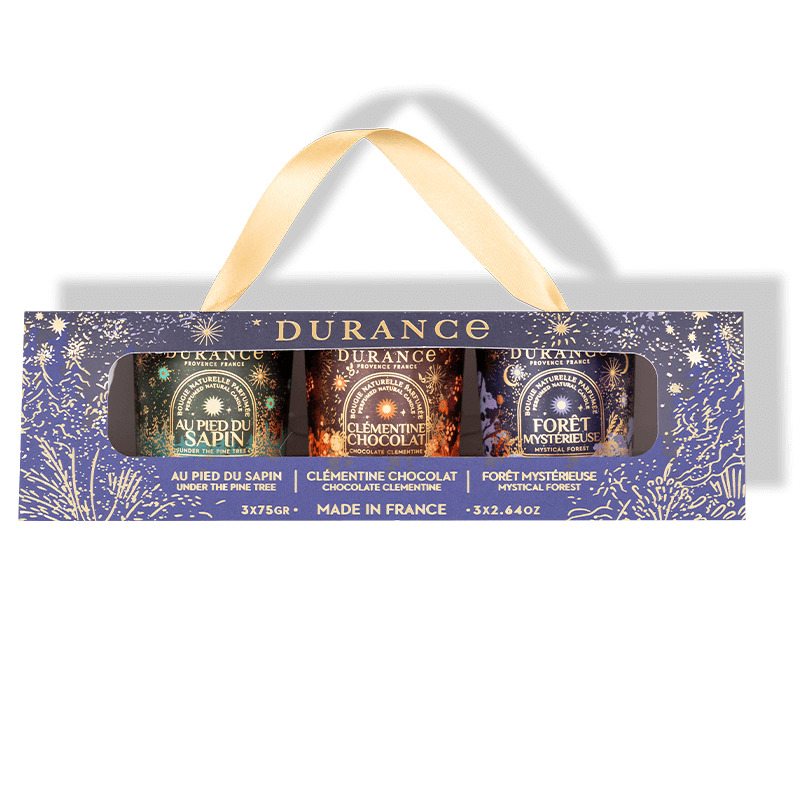 Plongez dans la magie des fêtes avec ce coffret réunissant trois bougies de Noël, pour un voyage olfactif au cœur d’un hiver enchanté. Laissez-vous envelopper par la fraîcheur boisée d’un sapin fraîchement décoré, la gourmandise réconfortante de la clémentine mêlée au chocolat fondant, et la profondeur envoûtante d’une forêt mystérieuse aux accents boisés. Un trio parfait pour parfumer votre intérieur au fil des fêtes et créer une atmosphère à la fois réconfortante, élégante et pleine d’émotions. Présenté dans un coffret raffiné, il s’offre aussi bien qu’il s’allume — un cadeau idéal pour partager la magie de Noël, signée Durance. Contenu : 1 bougie parfumée de cire naturelle 75 grammes Au pied du sapin 1 bougie parfumée de cire naturelle 75 grammes Clémentine Chocolat 1 bougie parfumée de cire naturelle 75 grammes Forêt Mystérieuse Dimensions du coffret : Hauteur : 10,5 cm Largeur : 20,8 cm