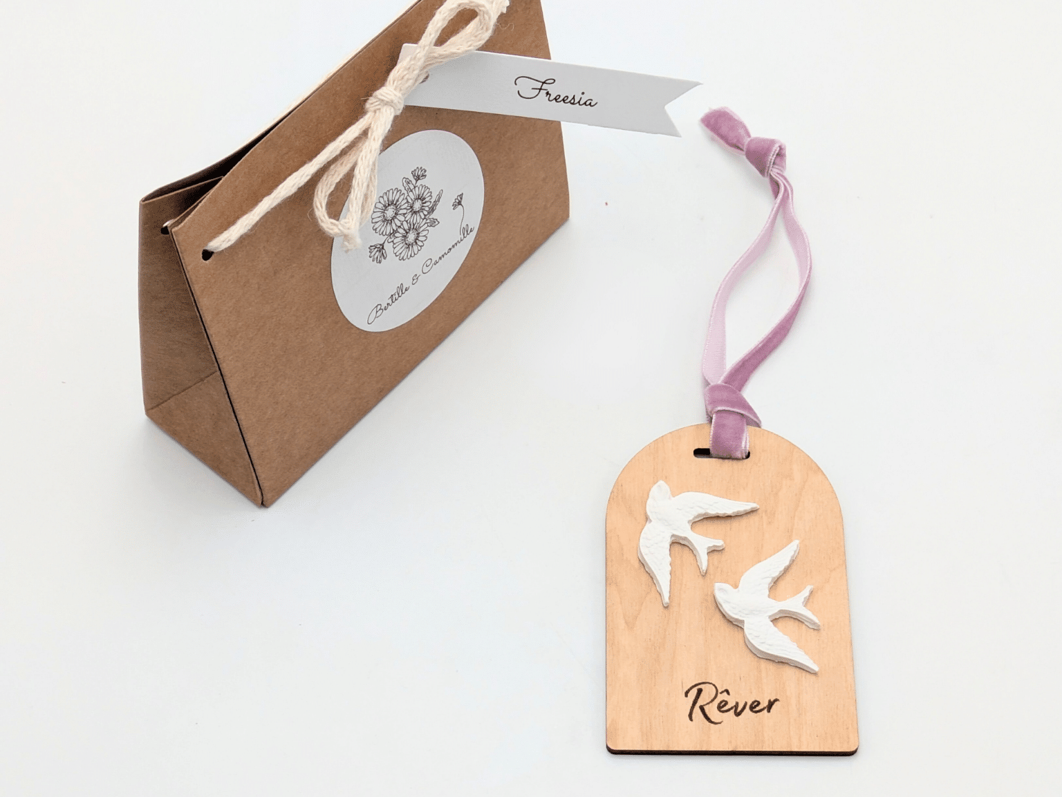 Suspendez votre décor parfumé à une poignée de porte, une fenêtre, un tiroir ou dans un dressing pour diffuser délicatement son parfum.Le petit élément en plâtre fixé sur le support bois est spécialement conçu pour absorber et diffuser les senteurs.Lorsque le parfum commence à s’estomper, vous pouvez raviver l’odeur en déposant quelques gouttes de notre concentré de parfum (vendu séparément), directement sur le plâtre.Ce geste simple vous permettra de profiter durablement de votre senteur préférée