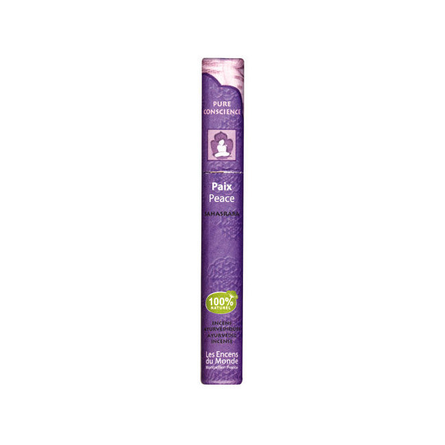 L' encens ayurvédique Paix est un mélange relaxant utilisé pour la méditation et le yoga, à base de santal , nard, acore odorant et fleurs indiennes. Il trouve une raisonnance au niveau du chakra de la couronne . Il est particulièrement utile en cas de stress , d'irritabilité, de peur ou d'agressivité.