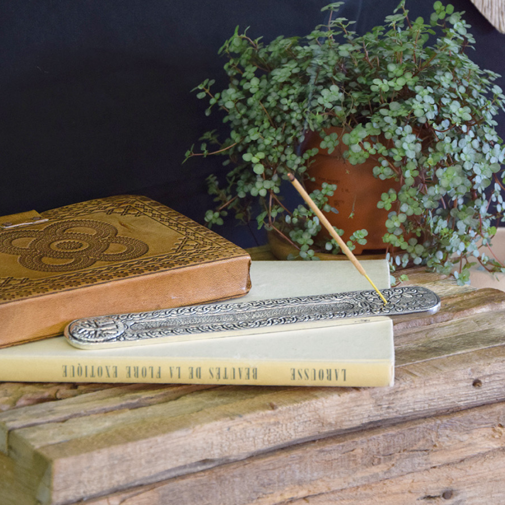 Porte-encens en métal motifs fleurs. Dimensions : 23 x 3 cm. Fabriqué en Inde.