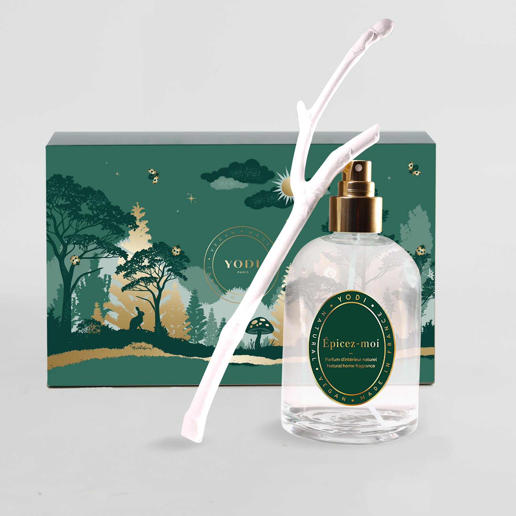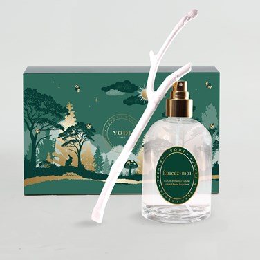 Le flacon spray en verre de 250 ml est rechargeable et peut s’utiliser directement ou avec le diffuseur House of Yodi.