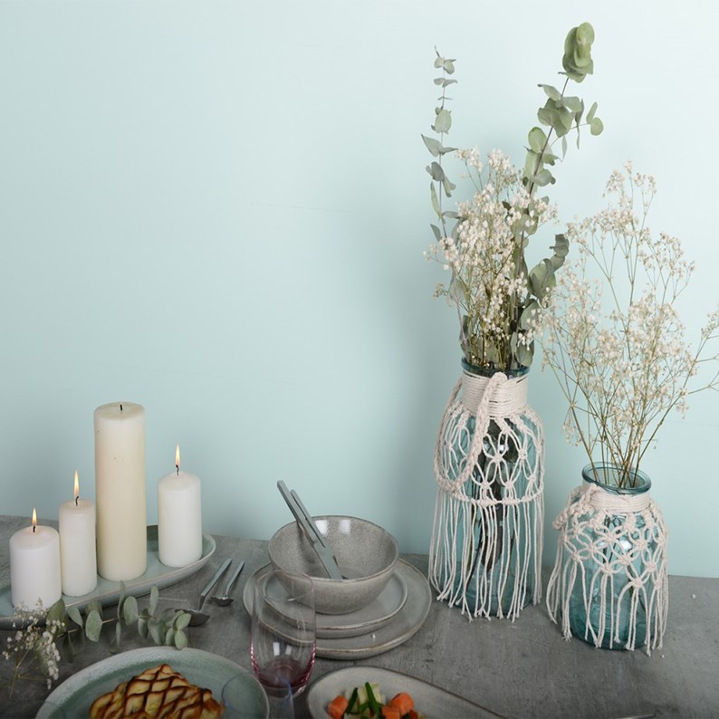 Vase en verre vert d\'eau macramé h.26cm  En savoir plus