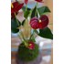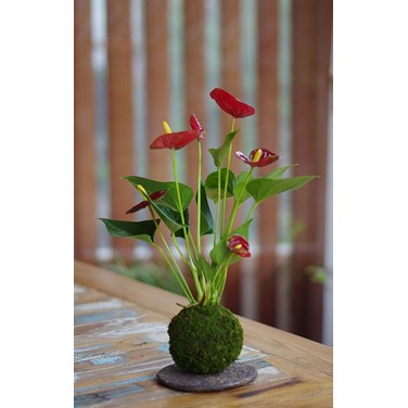 Ce Kokedama possède un anthurium originaire d'Amérique du Sud aux fleurs rouges vernisées.