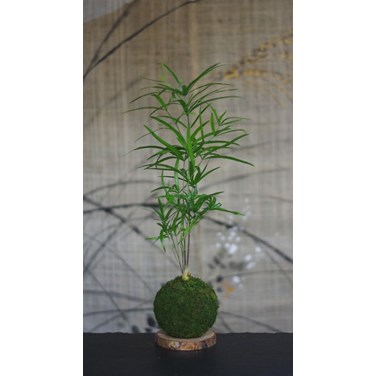 Ce Kokedama abrite un asparagus falcatus originaire d'Asie et d'Afrique et a un feuillage persistant et porte des petites épines sur ses tiges.