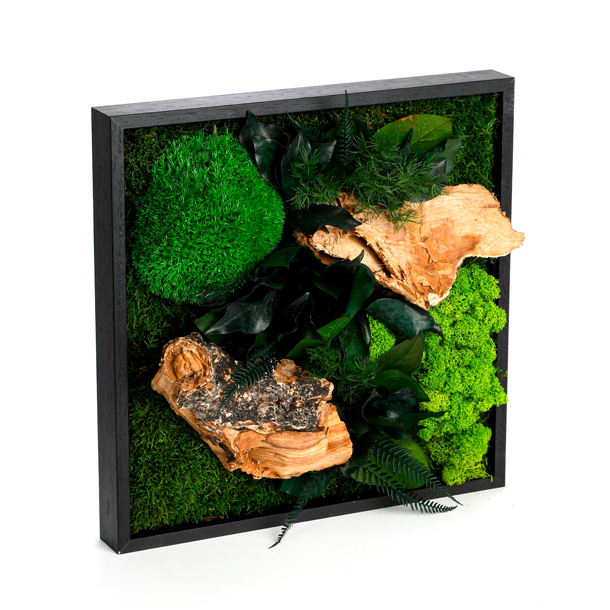 - Ce tableau associe un cadre en bois d'olivier issu de forêts françaises et des feuillages de fougère, de lierre, d'eucalyptus, de pittosporum ainsi que des éléments en bois.