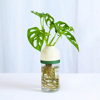 Les contenants ont été spécialement conçus pour la culture en eau : limitant son évaporation (en cas d'absence prolongée) et facilitant son renouvellement (pour éviter de manipuler la plante). Le bocal est isssu de bouteilles revalorisées et découpées, la coupole est imprimée en 3D à partir de sachets en plastique recyclés. La bague en gomme reliant les deux pièces est colorée à la main à Paris.