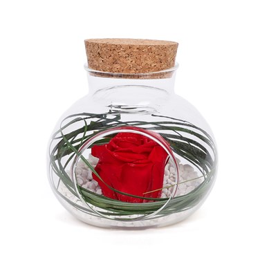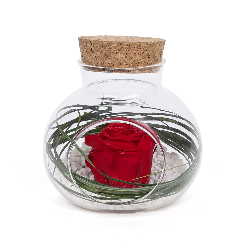 - La cloche de verre protège cette élégante rose stabilisée, installée au cœur d'une composition végétale.